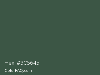 Hex #3c5645 Color is a dark green color and the nearest color is Gray Asparagus #465945. Hex code #3c5645 and RGB value is rgb(60,86,69). In RGB color space, this color is composed of 24% red, 34% green, 27% blue, In CMYK color space, this color is composed of 30% cyan, 0% magenta, 20% yellow , 66% black , In HSL color space, this color has a hue angle of 141° , 18% saturation and 29% lightness.