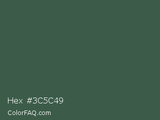 Hex #3c5c49 Color is a dark green color and the nearest color is Mineral Green #3f5d53. Hex code #3c5c49 and RGB value is rgb(60,92,73). In RGB color space, this color is composed of 24% red, 36% green, 29% blue, In CMYK color space, this color is composed of 35% cyan, 0% magenta, 21% yellow , 64% black , In HSL color space, this color has a hue angle of 144° , 21% saturation and 30% lightness.