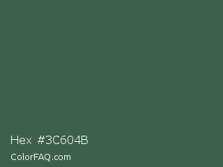 Hex #3c604b Color is a normal green color and the nearest color is Mineral Green #3f5d53. Hex code #3c604b and RGB value is rgb(60,96,75). In RGB color space, this color is composed of 24% red, 38% green, 29% blue, In CMYK color space, this color is composed of 38% cyan, 0% magenta, 22% yellow , 62% black , In HSL color space, this color has a hue angle of 145° , 23% saturation and 31% lightness.
