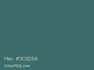 Hex #3c6d6a Color is a normal cyan color and the nearest color is William #3a686c. Hex code #3c6d6a and RGB value is rgb(60,109,106). In RGB color space, this color is composed of 24% red, 43% green, 42% blue, In CMYK color space, this color is composed of 45% cyan, 0% magenta, 3% yellow , 57% black , In HSL color space, this color has a hue angle of 176° , 29% saturation and 33% lightness.