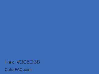 Hex #3c6db8 Color is a normal blue color and the nearest color is San Marino #456cac. Hex code #3c6db8 and RGB value is rgb(60,109,184). In RGB color space, this color is composed of 24% red, 43% green, 72% blue, In CMYK color space, this color is composed of 67% cyan, 41% magenta, 0% yellow , 28% black , In HSL color space, this color has a hue angle of 216° , 51% saturation and 48% lightness.