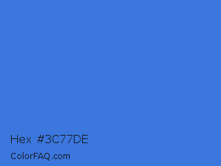 Hex #3c77de Color is a normal blue color and the nearest color is Royal Blue #4169e1. Hex code #3c77de and RGB value is rgb(60,119,222). In RGB color space, this color is composed of 24% red, 47% green, 87% blue, In CMYK color space, this color is composed of 73% cyan, 46% magenta, 0% yellow , 13% black , In HSL color space, this color has a hue angle of 218° , 71% saturation and 55% lightness.