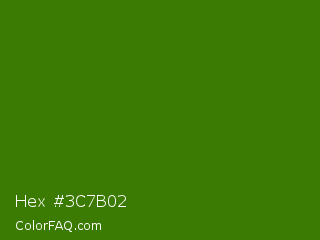 Hex #3c7b02 Color is a dark green color and the nearest color is Napier Green #2a8000. Hex code #3c7b02 and RGB value is rgb(60,123,2). In RGB color space, this color is composed of 24% red, 48% green, 1% blue, In CMYK color space, this color is composed of 51% cyan, 0% magenta, 98% yellow , 52% black , In HSL color space, this color has a hue angle of 91° , 97% saturation and 25% lightness.