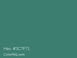 Hex #3c7f71 Color is a normal cyan color and the nearest color is Viridian #40826d. Hex code #3c7f71 and RGB value is rgb(60,127,113). In RGB color space, this color is composed of 24% red, 50% green, 44% blue, In CMYK color space, this color is composed of 53% cyan, 0% magenta, 11% yellow , 50% black , In HSL color space, this color has a hue angle of 167° , 36% saturation and 37% lightness.