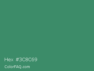 Hex #3c8c69 Color is a normal green color and the nearest color is Viridian #40826d. Hex code #3c8c69 and RGB value is rgb(60,140,105). In RGB color space, this color is composed of 24% red, 55% green, 41% blue, In CMYK color space, this color is composed of 57% cyan, 0% magenta, 25% yellow , 45% black , In HSL color space, this color has a hue angle of 154° , 40% saturation and 39% lightness.