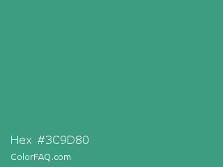 Hex #3c9d80 Color is a normal green color and the nearest color is Ocean Green #41aa78. Hex code #3c9d80 and RGB value is rgb(60,157,128). In RGB color space, this color is composed of 24% red, 62% green, 50% blue, In CMYK color space, this color is composed of 62% cyan, 0% magenta, 18% yellow , 38% black , In HSL color space, this color has a hue angle of 162° , 45% saturation and 43% lightness.