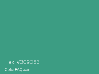 Hex #3c9d83 Color is a normal cyan color and the nearest color is Zomp #39a78e. Hex code #3c9d83 and RGB value is rgb(60,157,131). In RGB color space, this color is composed of 24% red, 62% green, 51% blue, In CMYK color space, this color is composed of 62% cyan, 0% magenta, 17% yellow , 38% black , In HSL color space, this color has a hue angle of 164° , 45% saturation and 43% lightness.