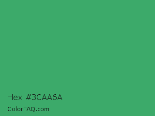 Hex #3caa6a Color is a normal green color and the nearest color is Chateau Green #40a860. Hex code #3caa6a and RGB value is rgb(60,170,106). In RGB color space, this color is composed of 24% red, 67% green, 42% blue, In CMYK color space, this color is composed of 65% cyan, 0% magenta, 38% yellow , 33% black , In HSL color space, this color has a hue angle of 145° , 48% saturation and 45% lightness.