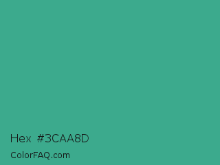 Hex #3caa8d Color is a normal cyan color and the nearest color is Zomp #39a78e. Hex code #3caa8d and RGB value is rgb(60,170,141). In RGB color space, this color is composed of 24% red, 67% green, 55% blue, In CMYK color space, this color is composed of 65% cyan, 0% magenta, 17% yellow , 33% black , In HSL color space, this color has a hue angle of 164° , 48% saturation and 45% lightness.