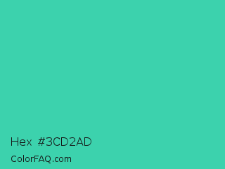 Hex #3cd2ad Color is a normal cyan color and the nearest color is Eucalyptus #44d7a8. Hex code #3cd2ad and RGB value is rgb(60,210,173). In RGB color space, this color is composed of 24% red, 82% green, 68% blue, In CMYK color space, this color is composed of 71% cyan, 0% magenta, 18% yellow , 18% black , In HSL color space, this color has a hue angle of 165° , 63% saturation and 53% lightness.
