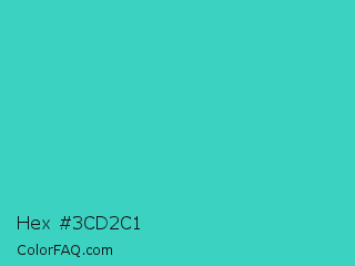 Hex #3cd2c1 Color is a normal cyan color and the nearest color is Turquoise PWG #30d5c8. Hex code #3cd2c1 and RGB value is rgb(60,210,193). In RGB color space, this color is composed of 24% red, 82% green, 76% blue, In CMYK color space, this color is composed of 71% cyan, 0% magenta, 8% yellow , 18% black , In HSL color space, this color has a hue angle of 173° , 63% saturation and 53% lightness.