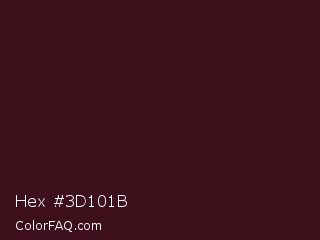 Hex #3d101b Color is a very dark red color and the nearest color is Dark Sienna #3c1414. Hex code #3d101b and RGB value is rgb(61,16,27). In RGB color space, this color is composed of 24% red, 6% green, 11% blue, In CMYK color space, this color is composed of 0% cyan, 74% magenta, 56% yellow , 76% black , In HSL color space, this color has a hue angle of 345° , 58% saturation and 15% lightness.