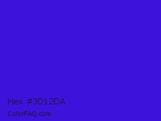 Hex #3d12da Color is a normal indigo color and the nearest color is Interdimensional Blue #360ccc. Hex code #3d12da and RGB value is rgb(61,18,218). In RGB color space, this color is composed of 24% red, 7% green, 85% blue, In CMYK color space, this color is composed of 72% cyan, 92% magenta, 0% yellow , 15% black , In HSL color space, this color has a hue angle of 253° , 85% saturation and 46% lightness.