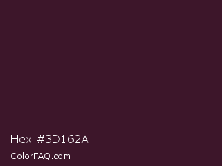 Hex #3d162a Color is a very dark rose color and the nearest color is Jon #3b1f1f. Hex code #3d162a and RGB value is rgb(61,22,42). In RGB color space, this color is composed of 24% red, 9% green, 16% blue, In CMYK color space, this color is composed of 0% cyan, 64% magenta, 31% yellow , 76% black , In HSL color space, this color has a hue angle of 329° , 47% saturation and 16% lightness.