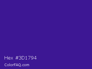 Hex #3d1794 Color is a normal indigo color and the nearest color is Pixie Powder #391285. Hex code #3d1794 and RGB value is rgb(61,23,148). In RGB color space, this color is composed of 24% red, 9% green, 58% blue, In CMYK color space, this color is composed of 59% cyan, 84% magenta, 0% yellow , 42% black , In HSL color space, this color has a hue angle of 258° , 73% saturation and 34% lightness.