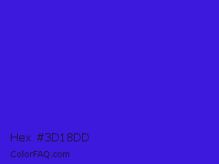 Hex #3d18dd Color is a normal indigo color and the nearest color is Interdimensional Blue #360ccc. Hex code #3d18dd and RGB value is rgb(61,24,221). In RGB color space, this color is composed of 24% red, 9% green, 87% blue, In CMYK color space, this color is composed of 72% cyan, 89% magenta, 0% yellow , 13% black , In HSL color space, this color has a hue angle of 251° , 80% saturation and 48% lightness.