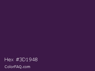 Hex #3d1948 Color is a very dark purple color and the nearest color is Deep Grape #381a51. Hex code #3d1948 and RGB value is rgb(61,25,72). In RGB color space, this color is composed of 24% red, 10% green, 28% blue, In CMYK color space, this color is composed of 15% cyan, 65% magenta, 0% yellow , 72% black , In HSL color space, this color has a hue angle of 286° , 48% saturation and 19% lightness.