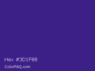 Hex #3d1f88 Color is a normal indigo color and the nearest color is Pixie Powder #391285. Hex code #3d1f88 and RGB value is rgb(61,31,136). In RGB color space, this color is composed of 24% red, 12% green, 53% blue, In CMYK color space, this color is composed of 55% cyan, 77% magenta, 0% yellow , 47% black , In HSL color space, this color has a hue angle of 257° , 63% saturation and 33% lightness.