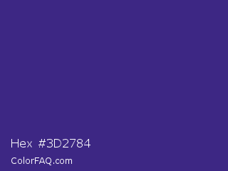 Hex #3d2784 Color is a normal indigo color and the nearest color is Minsk #3f307f. Hex code #3d2784 and RGB value is rgb(61,39,132). In RGB color space, this color is composed of 24% red, 15% green, 52% blue, In CMYK color space, this color is composed of 54% cyan, 70% magenta, 0% yellow , 48% black , In HSL color space, this color has a hue angle of 254° , 54% saturation and 34% lightness.