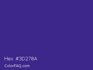 Hex #3d278a Color is a normal indigo color and the nearest color is Minsk #3f307f. Hex code #3d278a and RGB value is rgb(61,39,138). In RGB color space, this color is composed of 24% red, 15% green, 54% blue, In CMYK color space, this color is composed of 56% cyan, 72% magenta, 0% yellow , 46% black , In HSL color space, this color has a hue angle of 253° , 56% saturation and 35% lightness.