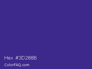 Hex #3d288b Color is a normal indigo color and the nearest color is Minsk #3f307f. Hex code #3d288b and RGB value is rgb(61,40,139). In RGB color space, this color is composed of 24% red, 16% green, 55% blue, In CMYK color space, this color is composed of 56% cyan, 71% magenta, 0% yellow , 45% black , In HSL color space, this color has a hue angle of 253° , 55% saturation and 35% lightness.