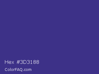 Hex #3d3188 Color is a normal indigo color and the nearest color is Minsk #3f307f. Hex code #3d3188 and RGB value is rgb(61,49,136). In RGB color space, this color is composed of 24% red, 19% green, 53% blue, In CMYK color space, this color is composed of 55% cyan, 64% magenta, 0% yellow , 47% black , In HSL color space, this color has a hue angle of 248° , 47% saturation and 36% lightness.