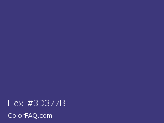 Hex #3d377b Color is a normal indigo color and the nearest color is Minsk #3f307f. Hex code #3d377b and RGB value is rgb(61,55,123). In RGB color space, this color is composed of 24% red, 22% green, 48% blue, In CMYK color space, this color is composed of 50% cyan, 55% magenta, 0% yellow , 52% black , In HSL color space, this color has a hue angle of 245° , 38% saturation and 35% lightness.