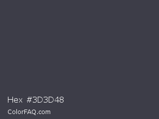 Hex #3d3d48 Color is a dark blue color and the nearest color is Ship Gray #3e3a44. Hex code #3d3d48 and RGB value is rgb(61,61,72). In RGB color space, this color is composed of 24% red, 24% green, 28% blue, In CMYK color space, this color is composed of 15% cyan, 15% magenta, 0% yellow , 72% black , In HSL color space, this color has a hue angle of 240° , 8% saturation and 26% lightness.