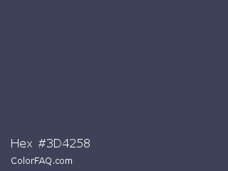 Hex #3d4258 Color is a dark blue color and the nearest color is Gun Powder #414257. Hex code #3d4258 and RGB value is rgb(61,66,88). In RGB color space, this color is composed of 24% red, 26% green, 35% blue, In CMYK color space, this color is composed of 31% cyan, 25% magenta, 0% yellow , 65% black , In HSL color space, this color has a hue angle of 229° , 18% saturation and 29% lightness.