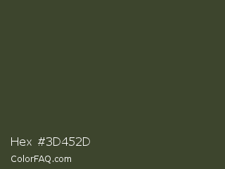 Hex #3d452d Color is a very dark green color and the nearest color is Kombu Green #354230. Hex code #3d452d and RGB value is rgb(61,69,45). In RGB color space, this color is composed of 24% red, 27% green, 18% blue, In CMYK color space, this color is composed of 12% cyan, 0% magenta, 35% yellow , 73% black , In HSL color space, this color has a hue angle of 80° , 21% saturation and 22% lightness.
