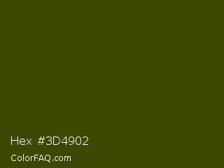 Hex #3d4902 Color is a very dark yellow color and the nearest color is Clover #384910. Hex code #3d4902 and RGB value is rgb(61,73,2). In RGB color space, this color is composed of 24% red, 29% green, 1% blue, In CMYK color space, this color is composed of 16% cyan, 0% magenta, 97% yellow , 71% black , In HSL color space, this color has a hue angle of 70° , 95% saturation and 15% lightness.
