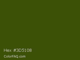 Hex #3d5108 Color is a very dark lime color and the nearest color is Clover #384910. Hex code #3d5108 and RGB value is rgb(61,81,8). In RGB color space, this color is composed of 24% red, 32% green, 3% blue, In CMYK color space, this color is composed of 25% cyan, 0% magenta, 90% yellow , 68% black , In HSL color space, this color has a hue angle of 76° , 82% saturation and 17% lightness.