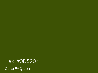 Hex #3d5204 Color is a very dark lime color and the nearest color is Verdun Green #495400. Hex code #3d5204 and RGB value is rgb(61,82,4). In RGB color space, this color is composed of 24% red, 32% green, 2% blue, In CMYK color space, this color is composed of 26% cyan, 0% magenta, 95% yellow , 68% black , In HSL color space, this color has a hue angle of 76° , 91% saturation and 17% lightness.