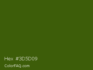 Hex #3d5d09 Color is a very dark green color and the nearest color is Dell #396413. Hex code #3d5d09 and RGB value is rgb(61,93,9). In RGB color space, this color is composed of 24% red, 36% green, 4% blue, In CMYK color space, this color is composed of 34% cyan, 0% magenta, 90% yellow , 64% black , In HSL color space, this color has a hue angle of 83° , 82% saturation and 20% lightness.
