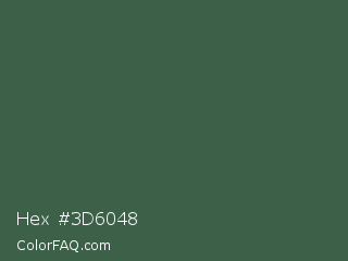 Hex #3d6048 Color is a normal green color and the nearest color is Killarney #3a6a47. Hex code #3d6048 and RGB value is rgb(61,96,72). In RGB color space, this color is composed of 24% red, 38% green, 28% blue, In CMYK color space, this color is composed of 36% cyan, 0% magenta, 25% yellow , 62% black , In HSL color space, this color has a hue angle of 139° , 22% saturation and 31% lightness.