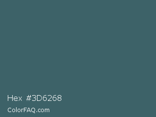 Hex #3d6268 Color is a normal cyan color and the nearest color is William #3a686c. Hex code #3d6268 and RGB value is rgb(61,98,104). In RGB color space, this color is composed of 24% red, 38% green, 41% blue, In CMYK color space, this color is composed of 41% cyan, 6% magenta, 0% yellow , 59% black , In HSL color space, this color has a hue angle of 188° , 26% saturation and 32% lightness.