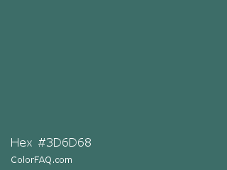 Hex #3d6d68 Color is a normal cyan color and the nearest color is William #3a686c. Hex code #3d6d68 and RGB value is rgb(61,109,104). In RGB color space, this color is composed of 24% red, 43% green, 41% blue, In CMYK color space, this color is composed of 44% cyan, 0% magenta, 5% yellow , 57% black , In HSL color space, this color has a hue angle of 174° , 28% saturation and 33% lightness.