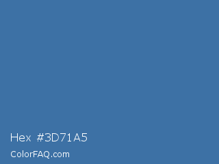 Hex #3d71a5 Color is a normal blue color and the nearest color is San Marino #456cac. Hex code #3d71a5 and RGB value is rgb(61,113,165). In RGB color space, this color is composed of 24% red, 44% green, 65% blue, In CMYK color space, this color is composed of 63% cyan, 32% magenta, 0% yellow , 35% black , In HSL color space, this color has a hue angle of 210° , 46% saturation and 44% lightness.