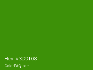 Hex #3d9108 Color is a dark green color and the nearest color is La Palma #368716. Hex code #3d9108 and RGB value is rgb(61,145,8). In RGB color space, this color is composed of 24% red, 57% green, 3% blue, In CMYK color space, this color is composed of 58% cyan, 0% magenta, 94% yellow , 43% black , In HSL color space, this color has a hue angle of 97° , 90% saturation and 30% lightness.