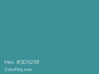 Hex #3d9298 Color is a normal cyan color and the nearest color is Zomp #39a78e. Hex code #3d9298 and RGB value is rgb(61,146,152). In RGB color space, this color is composed of 24% red, 57% green, 60% blue, In CMYK color space, this color is composed of 60% cyan, 4% magenta, 0% yellow , 40% black , In HSL color space, this color has a hue angle of 184° , 43% saturation and 42% lightness.