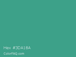 Hex #3da18a Color is a normal cyan color and the nearest color is Zomp #39a78e. Hex code #3da18a and RGB value is rgb(61,161,138). In RGB color space, this color is composed of 24% red, 63% green, 54% blue, In CMYK color space, this color is composed of 62% cyan, 0% magenta, 14% yellow , 37% black , In HSL color space, this color has a hue angle of 166° , 45% saturation and 44% lightness.