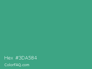 Hex #3da584 Color is a normal green color and the nearest color is Zomp #39a78e. Hex code #3da584 and RGB value is rgb(61,165,132). In RGB color space, this color is composed of 24% red, 65% green, 52% blue, In CMYK color space, this color is composed of 63% cyan, 0% magenta, 20% yellow , 35% black , In HSL color space, this color has a hue angle of 161° , 46% saturation and 44% lightness.