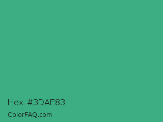 Hex #3dae83 Color is a normal green color and the nearest color is Mint #3eb489. Hex code #3dae83 and RGB value is rgb(61,174,131). In RGB color space, this color is composed of 24% red, 68% green, 51% blue, In CMYK color space, this color is composed of 65% cyan, 0% magenta, 25% yellow , 32% black , In HSL color space, this color has a hue angle of 157° , 48% saturation and 46% lightness.