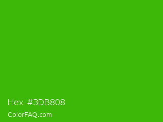 Hex #3db808 Color is a normal green color and the nearest color is Kelly Green #4cbb17. Hex code #3db808 and RGB value is rgb(61,184,8). In RGB color space, this color is composed of 24% red, 72% green, 3% blue, In CMYK color space, this color is composed of 67% cyan, 0% magenta, 96% yellow , 28% black , In HSL color space, this color has a hue angle of 102° , 92% saturation and 38% lightness.