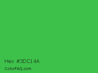 Hex #3dc14a Color is a normal green color and the nearest color is Wageningen Green #34b233. Hex code #3dc14a and RGB value is rgb(61,193,74). In RGB color space, this color is composed of 24% red, 76% green, 29% blue, In CMYK color space, this color is composed of 68% cyan, 0% magenta, 62% yellow , 24% black , In HSL color space, this color has a hue angle of 126° , 52% saturation and 50% lightness.