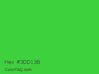 Hex #3dd13b Color is a normal green color and the nearest color is Lime Green #32cd32. Hex code #3dd13b and RGB value is rgb(61,209,59). In RGB color space, this color is composed of 24% red, 82% green, 23% blue, In CMYK color space, this color is composed of 71% cyan, 0% magenta, 72% yellow , 18% black , In HSL color space, this color has a hue angle of 119° , 62% saturation and 53% lightness.