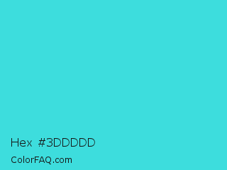 Hex #3ddddd Color is a normal cyan color and the nearest color is Turquoise #40e0d0. Hex code #3ddddd and RGB value is rgb(61,221,221). In RGB color space, this color is composed of 24% red, 87% green, 87% blue, In CMYK color space, this color is composed of 72% cyan, 0% magenta, 0% yellow , 13% black , In HSL color space, this color has a hue angle of 180° , 70% saturation and 55% lightness.