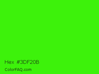Hex #3df20b Color is a normal green color and the nearest color is Neon Green #39ff14. Hex code #3df20b and RGB value is rgb(61,242,11). In RGB color space, this color is composed of 24% red, 95% green, 4% blue, In CMYK color space, this color is composed of 75% cyan, 0% magenta, 95% yellow , 5% black , In HSL color space, this color has a hue angle of 107° , 91% saturation and 50% lightness.