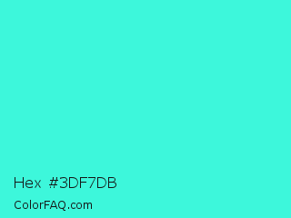Hex #3df7db Color is a normal cyan color and the nearest color is Turquoise #40e0d0. Hex code #3df7db and RGB value is rgb(61,247,219). In RGB color space, this color is composed of 24% red, 97% green, 86% blue, In CMYK color space, this color is composed of 75% cyan, 0% magenta, 11% yellow , 3% black , In HSL color space, this color has a hue angle of 171° , 92% saturation and 60% lightness.