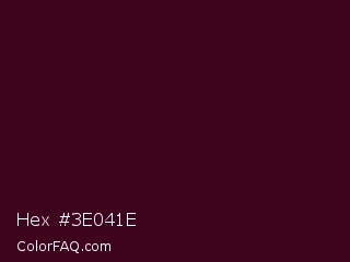 Hex #3e041e Color is a very dark rose color and the nearest color is Toledo #3a0020. Hex code #3e041e and RGB value is rgb(62,4,30). In RGB color space, this color is composed of 24% red, 2% green, 12% blue, In CMYK color space, this color is composed of 0% cyan, 94% magenta, 52% yellow , 76% black , In HSL color space, this color has a hue angle of 333° , 88% saturation and 13% lightness.